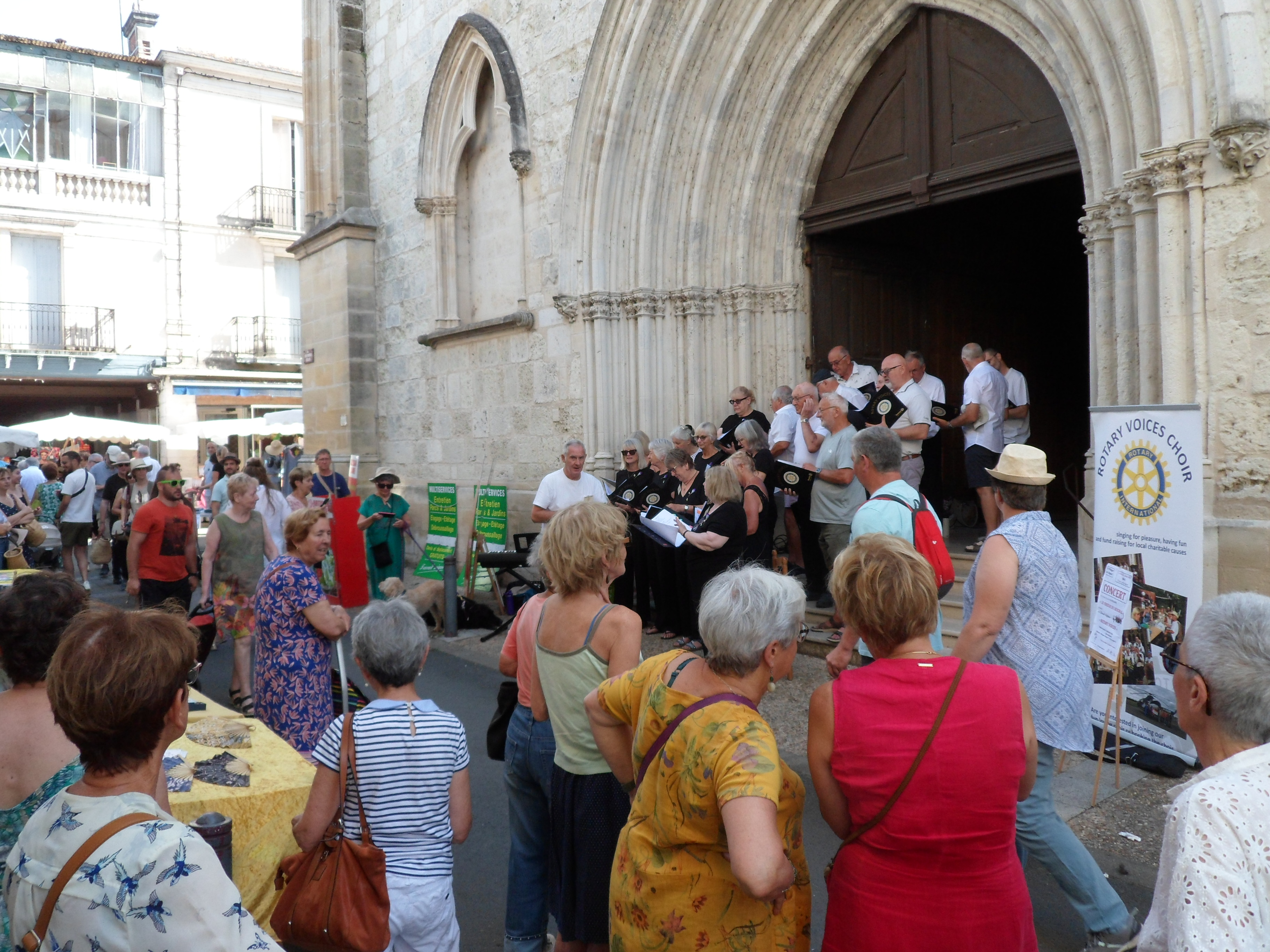 Saturday began with a lunchtime concert on the steps of the main church in St Foy La Grande with Rotary Voices singing to a large crowd attending the local market, all monies donated during this performance were given to the church itself. Later that afternoon the choir headed back to the hall in St Philippe de Seignal, rehearsing the joint songs with the French choir in French and English in preparation for the concert that evening. The evening concert was a huge success with both choirs giving excellent individual performances and a spectacular finish, both choirs joining together to sing a number of specially prepared pieces.