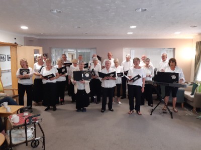 | The choir travelled down the A1 to St Neots to sing for Poppyfields Care Home. A lovely venue and a lovely audience. The choir had great fun singing for these lovely ladies and gents who got really involved in the sing a longs, one lady even getting up to direct the choir for a song. At the end of the afternoon the audience donated £46.00 for the choir's charity fund. |