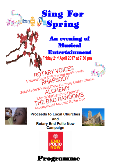 | An evening of entertainment with music from Rotary Voices, Rhapsody, Alchemy and The Bad Randoms. Proceeds to local churches and Rotary End Polio Now campaign. |