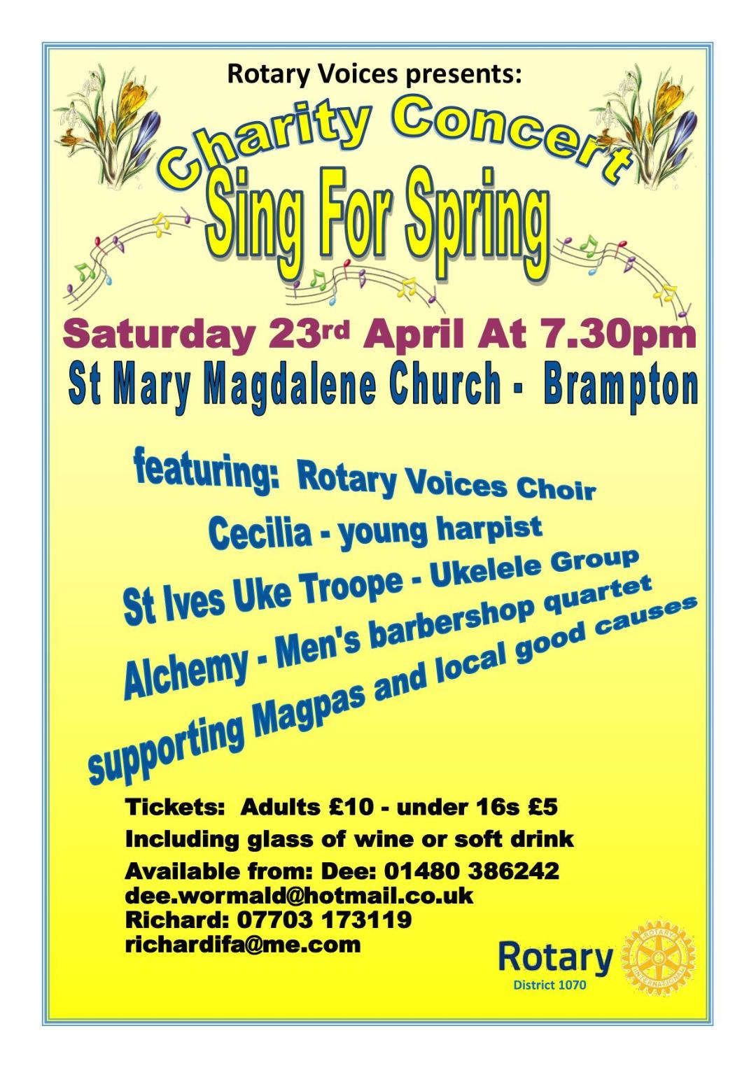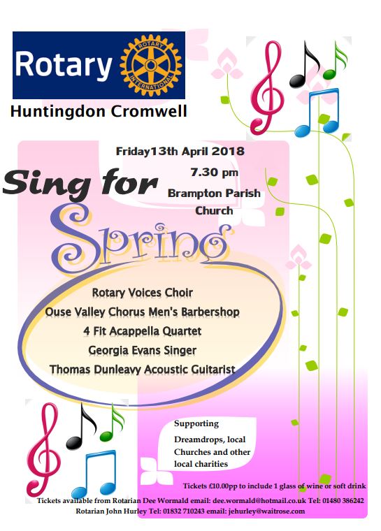 | Rotary Voices Annual Spring Concert, a varied and exciting programme of choirs, quartets and solo singers, fund raising for local charities and worthy causes the concert begins at 7.30 pm. |